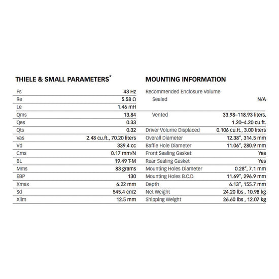 988308 Bocina Eminence Impero-12A Especificaciones Diámetro externo: 12” Impedancia nominal: 8 ohms Manejo de potencia: 1100 W Sensibilidad: 93 dB Rango de frecuencia: 56 Hz – 3 KHz Frecuencia de resonancia (Fs): 43 Hz Diámetro de la bobina: 1.75” Tipo de magneto: Ferrita Peso del magneto: 109 oz. Material de la canasta: Aluminio TE PEDIMOS QUE ANTES DE OFERTAR CONFIRMES Y/O VALIDEZ LA EXISTENCIA DE NUESTROS PRODUCTOS, YA QUE DEBIDO A LA DEMANDA ESTOS PUEDEN LLEGAR A ESCASEAR. Forma de comprar: -En caso de que requieras comprar más de una pieza del mismo producto te pedimos que por favor ofertes y/o compres de manera individual (por pieza) ya que de esta manera cada producto viajará amparado con su propio número de guía y su respectivo seguro. Garantías: -Todas nuestras garantías amparan defectos de fábrica, no así el mal uso o el mal manejo de los equipos. FACTURACIÓN: Todos nuestros productos ya Incluyen IVA y la factura ampara la legalidad al 100% de todos nuestros productos. Si deseas factura favor de solicitarla después de haber realizado tu compra. Una vez que hayas recibido el producto a tu entera satisfacción procederemos a enviarte tu factura vía correo electrónico. FORMAS DE PAGO: Pago a través de Mercado Pago que incluye: - Pagos a Meses sin intereses solo con tarjeta de Crédito bancarias participantes. - Pagos con tarjeta de crédito o débito VISA, Mastercard o American Express - Pagos en efectivo en Oxxo, 7 eleven - Saldo en Mercado Pago Si pagaste en OXXO, Seven Eleven, o deposito en efectivo, tu compra tardará en acreditarse, por lo que una vez acreditado tu pago podrás escribirnos desde tu compra. ENVÍOS: *Todos nuestros envíos van asegurados al 100% y se realizan de lunes a viernes después de las 2:00 p.m. El tiempo de entrega depende completamente de la empresa de mensajería y queda fuera de toda nuestra responsabilidad cualquier retraso que se pueda presentar por parte de la mensajería. *Si tu compra se acredita después de la 1:00 p.m. tu paquete se enviará al día hábil siguiente. *Sábados, Domingos y días festivos no hay recolección por parte de las paqueterías. LAS IMÁGENES EXPUESTAS SON CON FINES ILUSTRATIVOS. Las Especificaciones y las imágenes están sujetas a cambios sin previo aviso. Los precios pueden variar sin previo aviso. En caso de que el producto no se encuentre en existencia o el precio sea incorrecto, nos reservamos el derecho de cancelar las órdenes. TE PEDIMOS QUE ANTES DE OFERTAR CONFIRMES Y/O VALIDEZ LA EXISTENCIA DE NUESTROS PRODUCTOS, YA QUE DEBIDO A LA DEMANDA ESTOS PUEDEN LLEGAR A ESCASEAR. Forma de comprar: -En caso de que requieras comprar más de una pieza del mismo producto te pedimos que por favor ofertes y/o compres de manera individual (por pieza) ya que de esta manera cada producto viajará amparado con su propio número de guía y su respectivo seguro. Garantías: -Todas nuestras garantías amparan defectos de fábrica, no así el mal uso o el mal manejo de los equipos. FACTURACIÓN: Todos nuestros productos ya Incluyen IVA y la factura ampara la legalidad al 100% de todos nuestros productos. Si deseas factura favor de solicitarla después de haber realizado tu compra. Una vez que hayas recibido el producto a tu entera satisfacción procederemos a enviarte tu factura vía correo electrónico. FORMAS DE PAGO: Pago a través de Mercado Pago que incluye: - Pagos a Meses sin intereses solo con tarjeta de Crédito bancarias participantes. - Pagos con tarjeta de crédito o débito VISA, Mastercard o American Express - Pagos en efectivo en Oxxo, 7 eleven - Saldo en Mercado Pago Si pagaste en OXXO, Seven Eleven, o deposito en efectivo, tu compra tardará en acreditarse, por lo que una vez acreditado tu pago podrás escribirnos desde tu compra. ENVÍOS: *Todos nuestros envíos van asegurados al 100% y se realizan de lunes a viernes después de las 2:00 p.m. El tiempo de entrega depende completamente de la empresa de mensajería y queda fuera de toda nuestra responsabilidad cualquier retraso que se pueda presentar por parte de la mensajería. *Si tu compra se acredita después de la 1:00 p.m. tu paquete se enviará al día hábil siguiente. *Sábados, Domingos y días festivos no hay recolección por parte de las paqueterías. LAS IMÁGENES EXPUESTAS SON CON FINES ILUSTRATIVOS. Las Especificaciones y las imágenes están sujetas a cambios sin previo aviso. Los precios pueden variar sin previo aviso. En caso de que el producto no se encuentre en existencia o el precio sea incorrecto, nos reservamos el derecho de cancelar las órdenes.